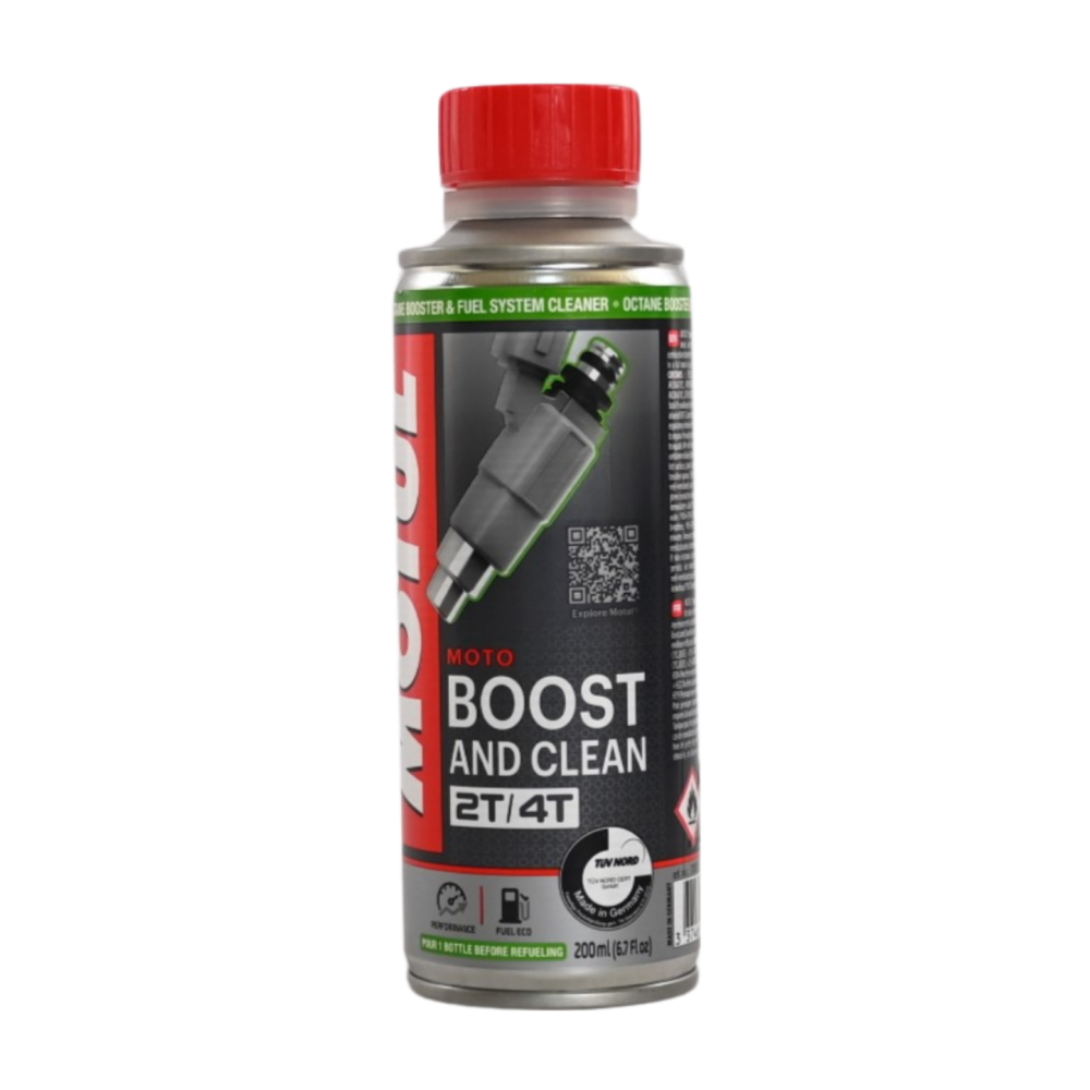 MOTUL BOOST AND CLEAN MOTO عبارة عن مادة مضافة للوقود تضاف إلى البنزين، ويمكن استخدامها في جميع أنواع محركات الدراجات النارية ثنائية الشوط ورباعية الأشواط. تسمح تركيبته القوية والمخصصة بزيادة رقم الأوكتان وتنظيف المكربنات والحاقن والصمامات ومنافذ النقل وغرف الاحتراق. يقوم أيضًا بتنظيف وتشحيم دائرة الوقود بأكملها.